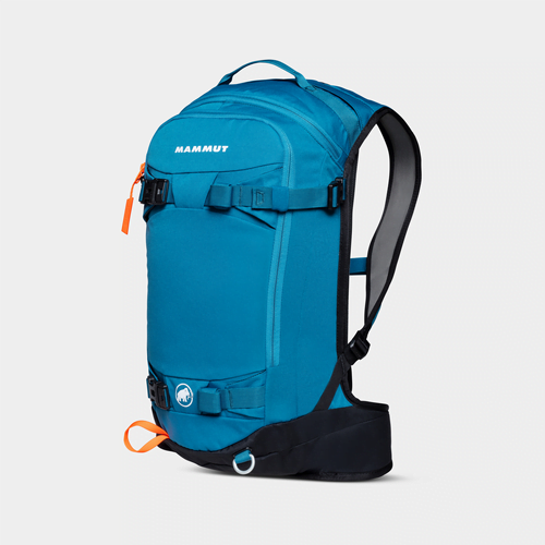 Recycled main material | Full rear zipper access to the main compartment | Front pocket for avalanche safety equipment | Soft-lined goggle compartment | Diagonal ski carrier | Snowboard attachment | Attachments for ice tool and walking sticks | Hydration system-compatible | SOS label with emergency instructions | High-density, 2-layer EVA back padding; hip belt and shoulder straps with stretch fabric cover