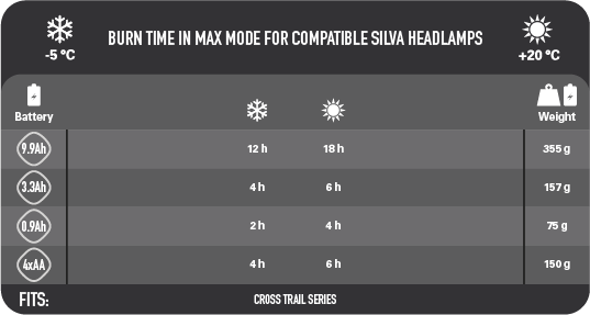 Our battery line-up gives you the opportunity to find the right balance between burn time and weight. The power range covers a wide span of activities, from a small head-mounted battery for a fast run to a powerful pack for a long hike.