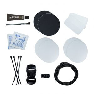 - Kit Includes: 6 clear Tenacious Tape patches (3” rounds and 1.5”x2.5”), 2 black nylon Tenacious Tape patches (3” rounds), Seam Grip WP sealant (0.25 oz), applicator brush, alcohol wipes, zip ties, 1” Dual-Adjust Buckle, Ellipse Cord Lock, 80” of Shock Cord, and instructions